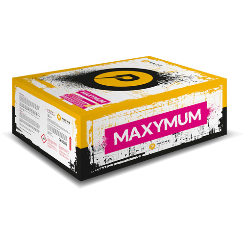 Die Maxymum XXL Feuerwerksbatterie von PyroProdukt. Performance Verbundfeuerwerk mit verschiedene Fächerungen und Schussfolgen beinhaltet I Shape, Z Shape, Fan Shape und W Shape. Kräftiges Blitzknall Salut Finale.
